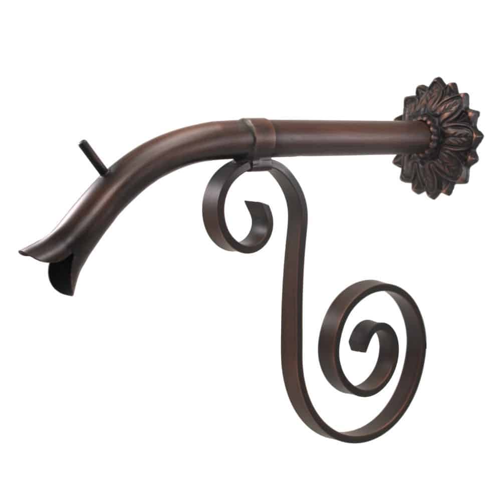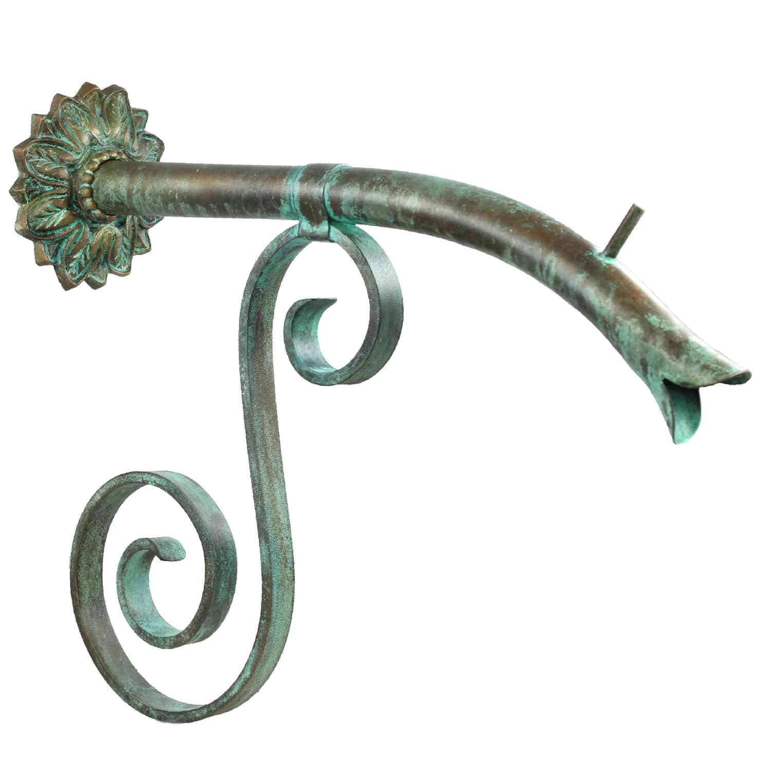 The Courtyard series of spouts are designed to evoke the charm of old-world European courtyards. This large Courtyard spout made from 100% copper and 100% brass backplate is our interpretation of the handmade spouts located throughout Europe. This larger-sized spout is perfect for use as a solitary water feature emitter that spills into mid-sized fountain basins, fountain pots, pools, and spas. Since the Courtyard series is copper, the spouts are safe to install in pools, spas, and on porous surfaces. Copper will not rust like iron which eventually discolors surfaces and water. The entire Courtyard series of spouts can be custom-made to meet any size or shape specifications. Shown in Distressed Copper and Sealed Verde. Shown in picture is the Nikila backplate, but the Courtyard Spout is also available with other backplate styles. Product Details: