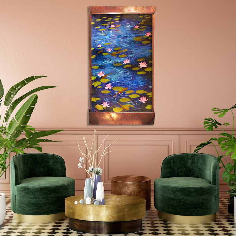 This fountain is 8' tall, 4' wide, 7' deep. It is inspired by Monet and is a beautiful addition to any home. Both tranquil and elegant, this is one of the larger pieces that we do, and is a real showstopper. Highlights: