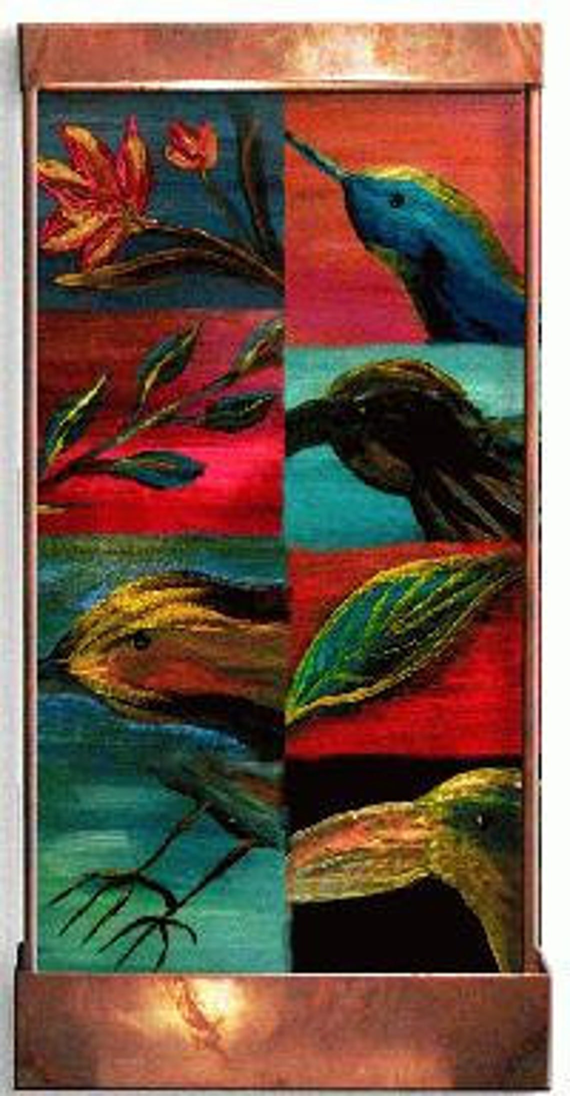 This is Pamela's latest fountain, a collage of eight still life paintings into one...rather elegant, if i might say...wall fountain. One of the hats I wear here at the studio, is official photographer for essentially everything. It's not often that I'm surprised but when I began to put the still life images up on the screen to view, I kept scratching my head because there was a dimensionality to these still lifes that's hard to figure. To me, they look like carved sculptures rather than paintings. Excellent depth. It's no secret that Pamela LOVES birds. At the moment we have 37+ bird houses here at CrossBow and the number continues to climb. If you want a truly elegant fountain...and really like birds...look no further. Highlights: