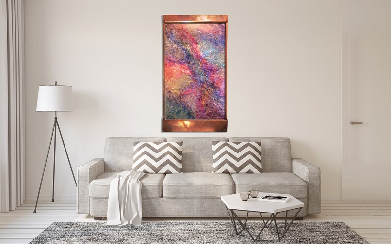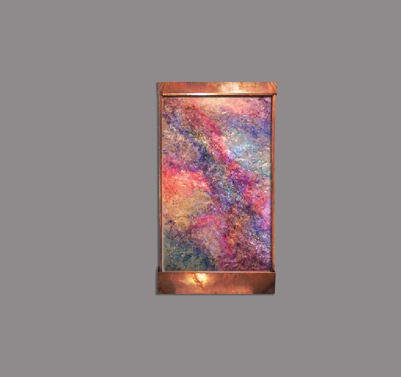 The Pastel Canyon wall fountain is 48" tall, 28" wide, and 6" deep. The face is a heavily textured aluminum with pastel pigment coloration faced with a sheet of acrylic that the water flows down. Abstract, yet approachable, this would look great in almost any room in a house. Highlights:
