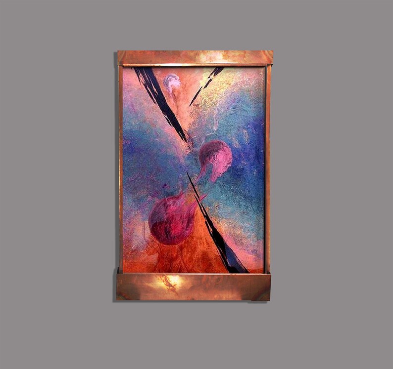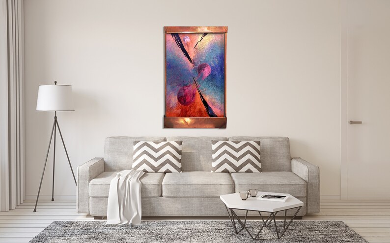 Sorcery was our very first galaxy fountain, and Pastel Sorcery is a more feminine version of that piece. It is 48″ tall, 28″ wide, 6″ deep and comes with everything you need to hang and run it. An LED light hood can be purchased separately. Highlights: