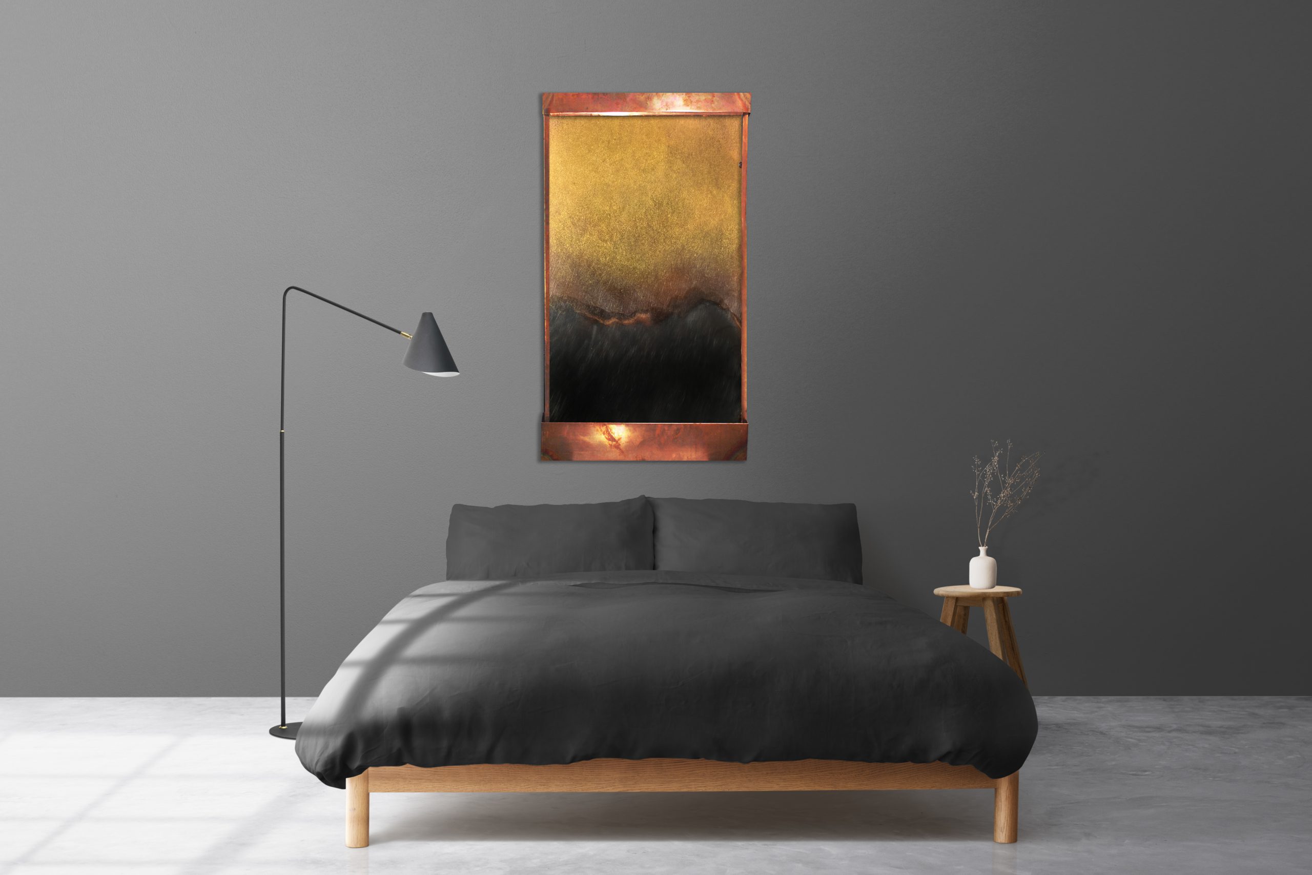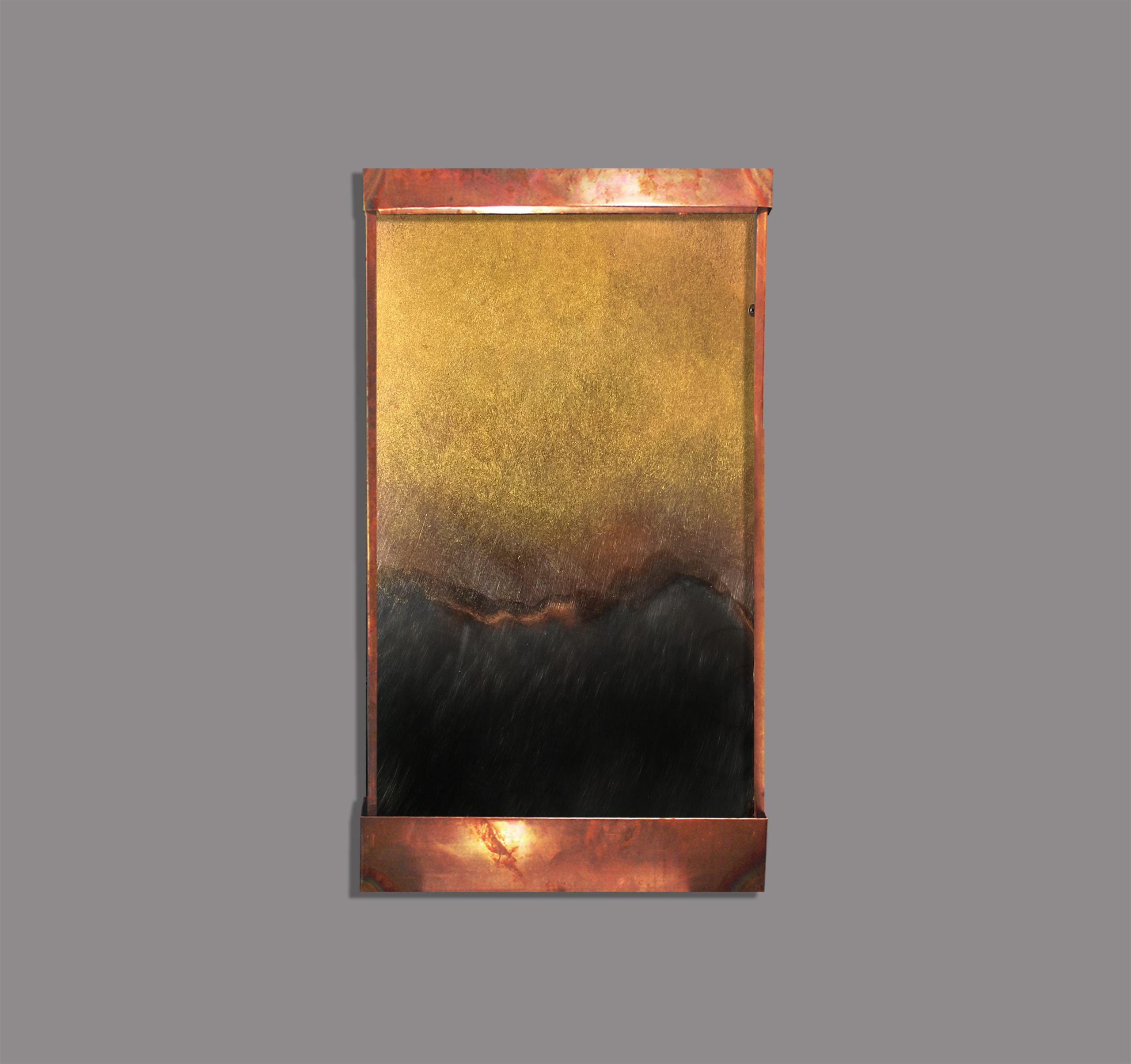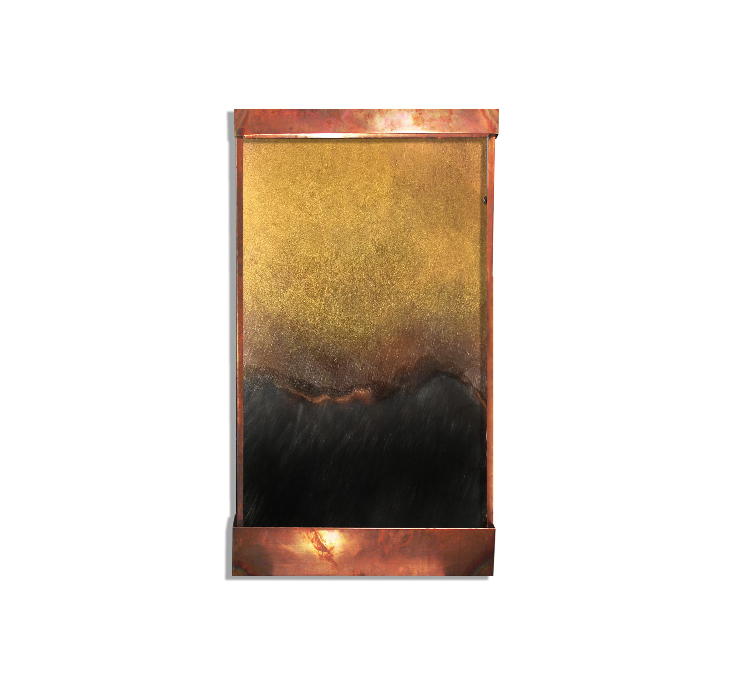 This fountain we did backwards in a way. First it was a tabletop fountain, but we got such a good response, that we made it a full sized one. It has the colors of the old world, yet the forms of the modern one- gorgeous shades of blue, copper, gold, and oxidized copper. An LED light hood is available upon request to make an already beautiful piece glow in the right setting. We can make this virtually any size or coloration. It comes with everything you need to hang it, and run.