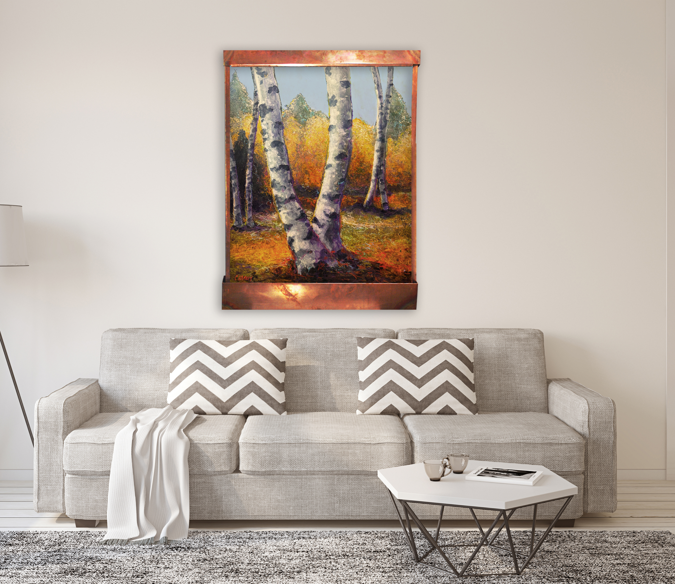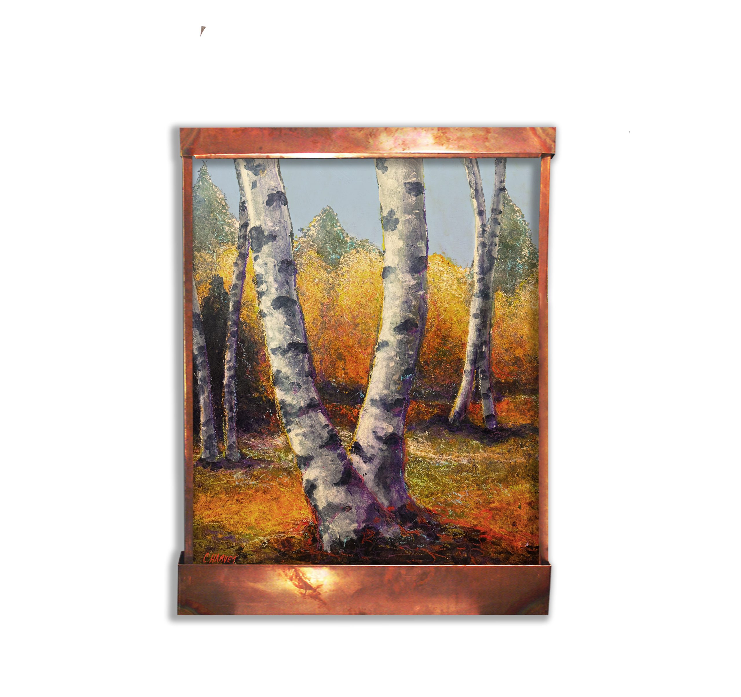 This was a custom order for a client of ours in the mid-west. It is a lovely wall fountain of birch trees in autumn. The water flows down the face of it in a calm, tranquil manner. It is 46″ tall, 35″ wide, and 6″ deep. An LED light hood can be purchased separately. It can be made in custom sizes too! It comes with all you need to hang and run it. |