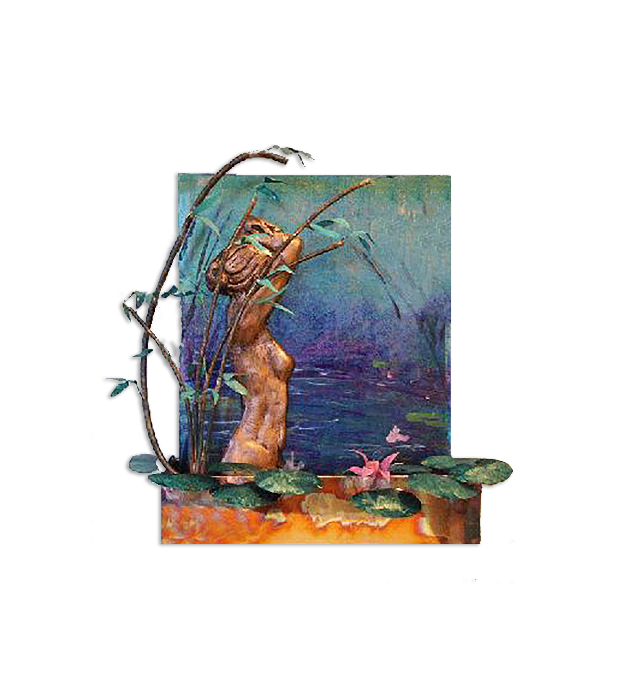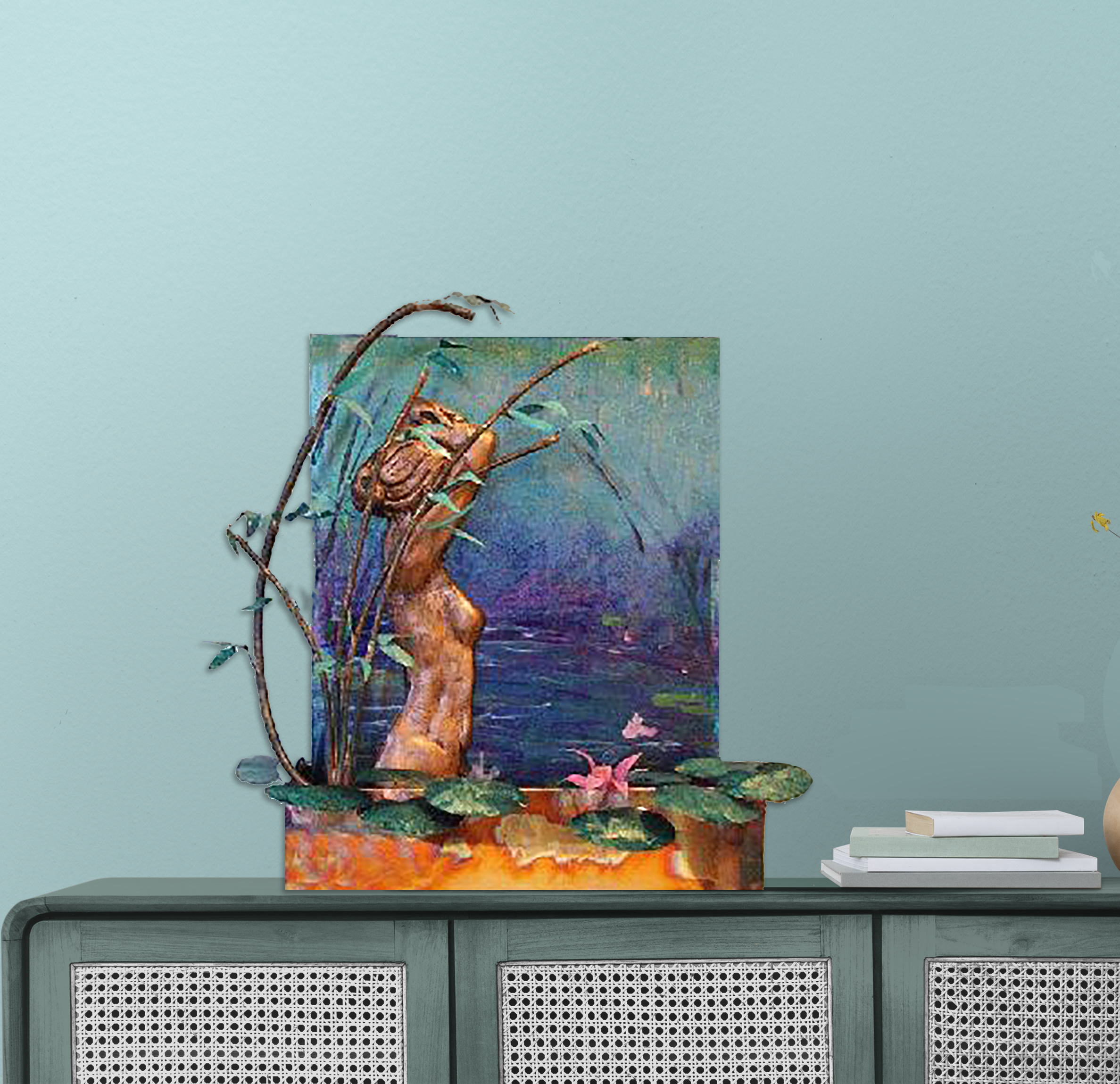 This is one of our hybrid fountains- the figure is hand-cast and the water flows over the panel behind her. It feels like you can disappear in to the scene amid the sound of the water. 21″ by 21″ by 7″ deep, it comes with everything you need to run it.
