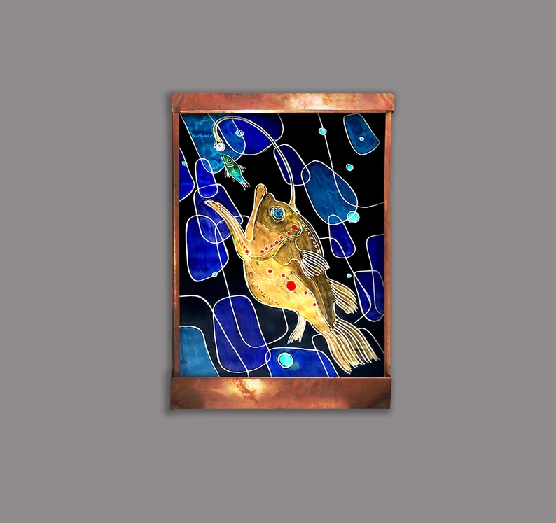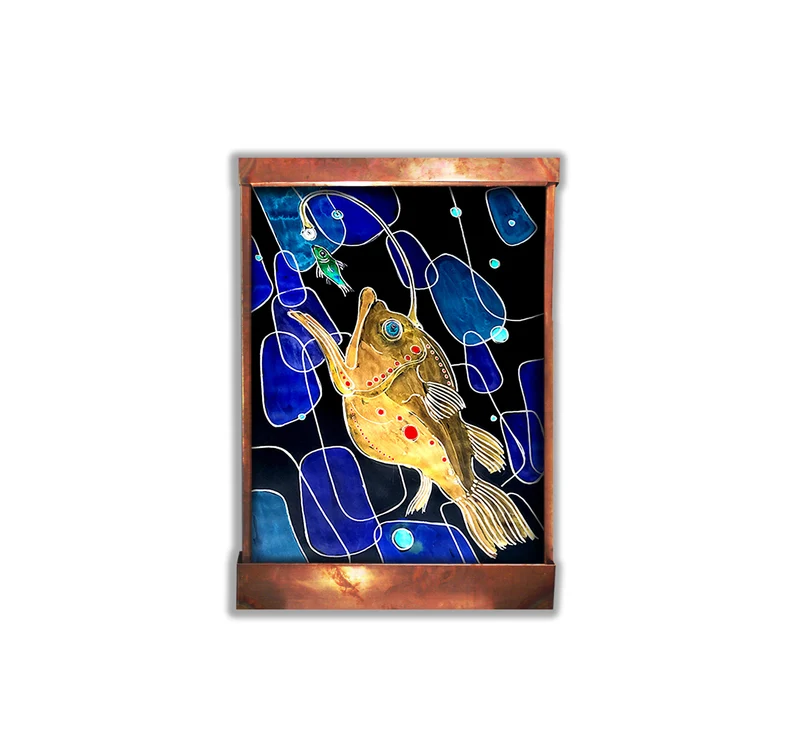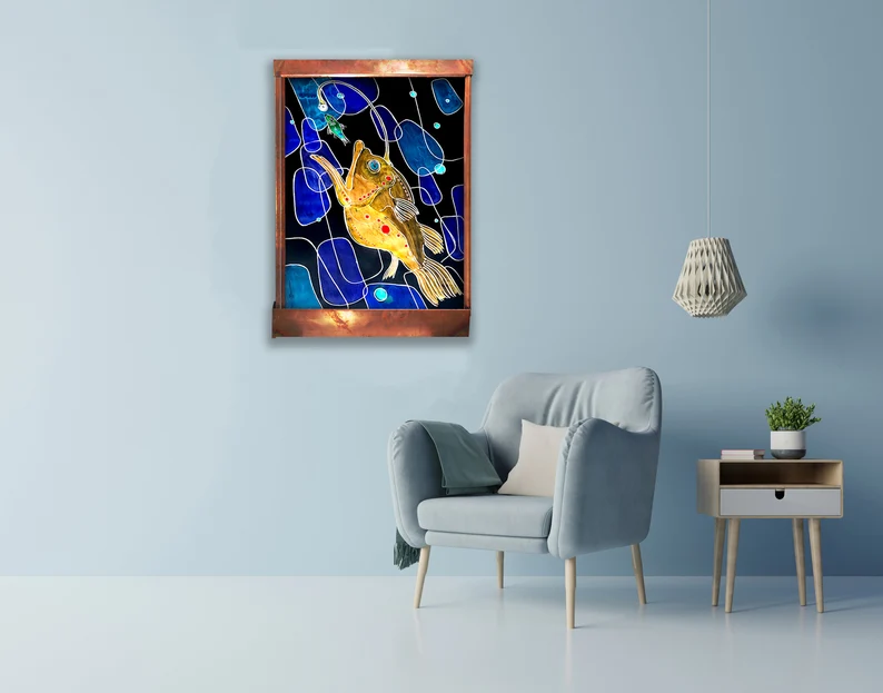 As vast as outer space is, there is something equally mysterious out there… and much closer: the depths of the ocean. Here we have an angler fish exploring these very depths amid the abstract waters of our dreams.
