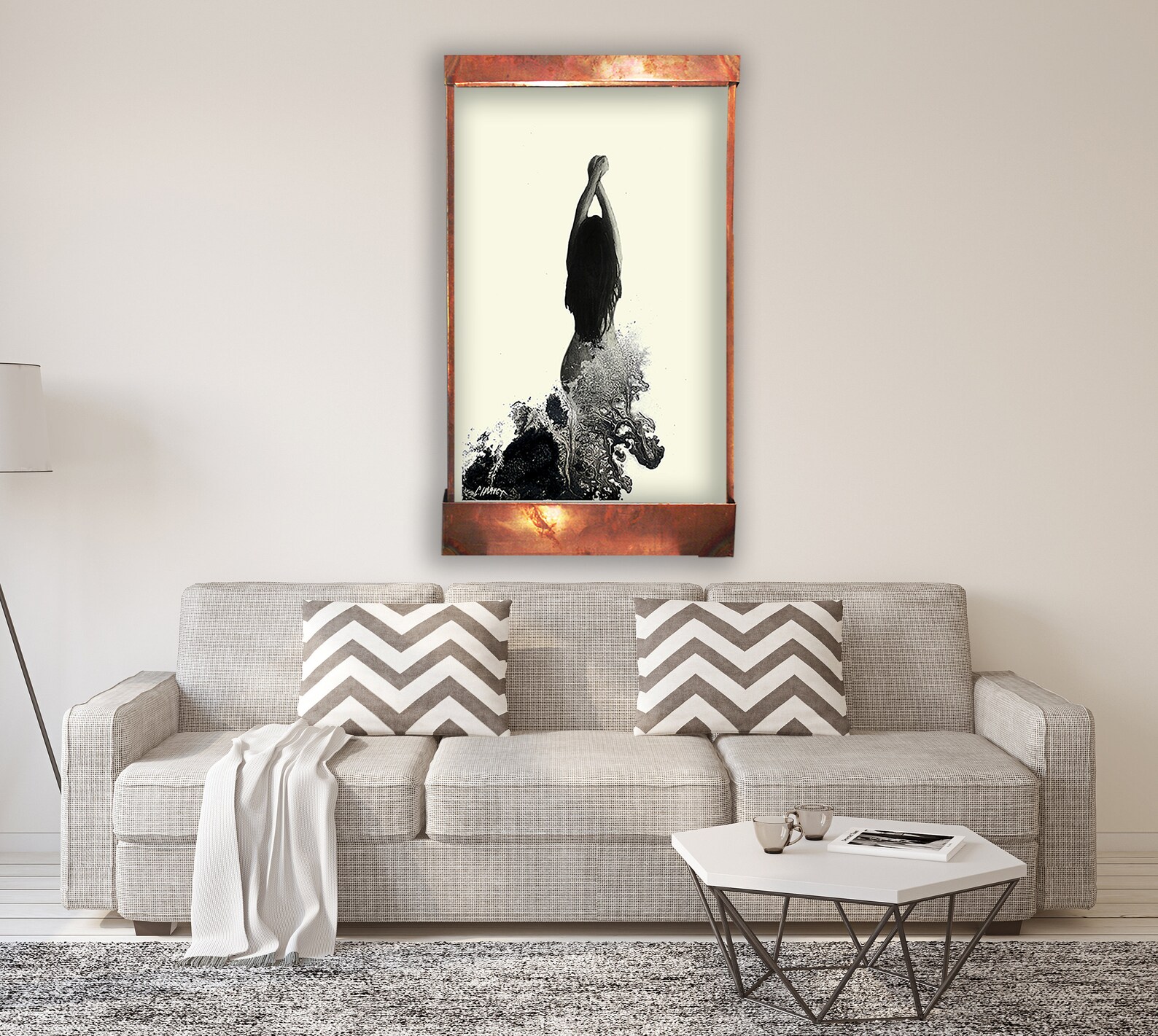 Mixing classical with the abstract, The Nereid is a stunning piece in black and white that will be a conversation-starter where ever you put her. 48″ tall, 28″ wide, 6″ deep, it comes with everything you need to hang it and run it. An LED light hood can be purchased separately.