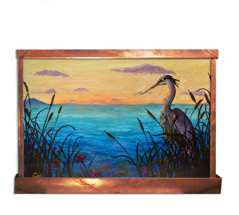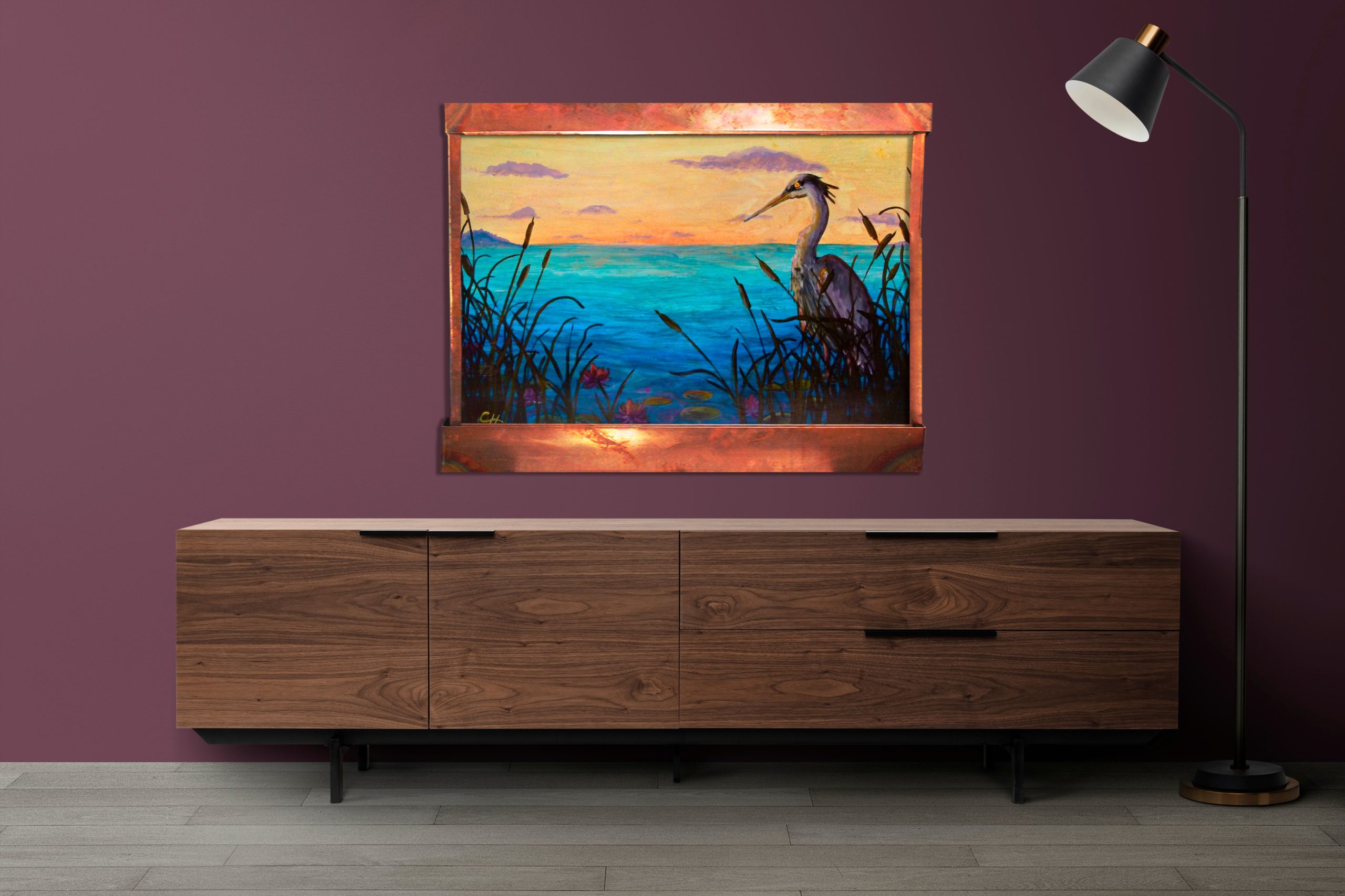 This wall fountain is 36″ tall, 48″ wide and captures first light of dawn down in Florida. The water flows down in a sheet over the face of the artwork giving it a beautiful, shimmering effect. Perfect for home or office, this is a brand new piece for our studio. It is 48″ wide, 36″ wide, 6″ deep and comes with everything you need to hang and run it. An LED light hood can be purchased separately. Ask us about custom sizes and special orders! |