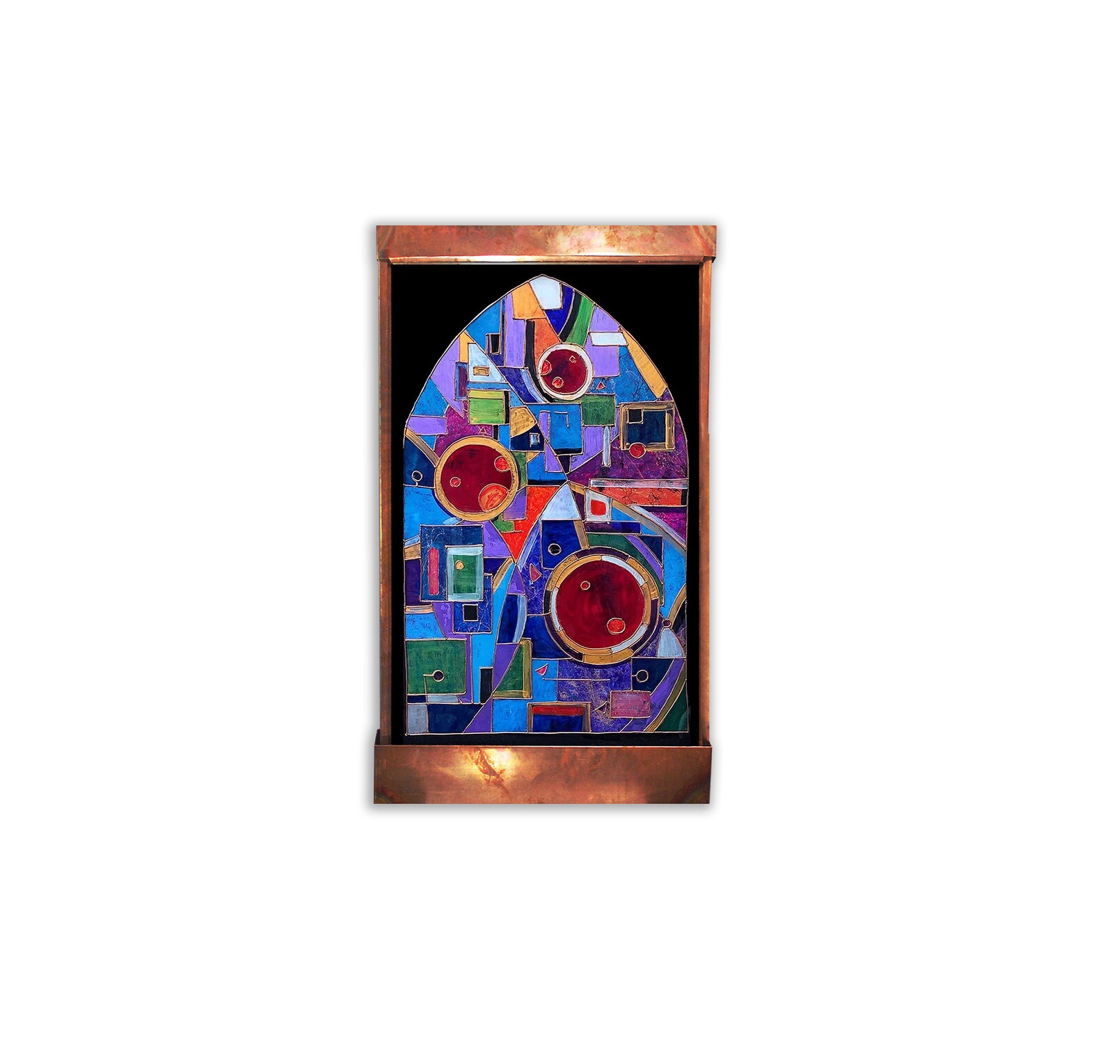 The genesis of this one came from one of our clients. She’d just come back from Spain and wanted a piece that captured that mix of Old World color and feel with a more modern sensibility of, say a Miro or a Paul Klee. The colors here are vibrant, and the shapes are such that you will see something different every time you look at it. |