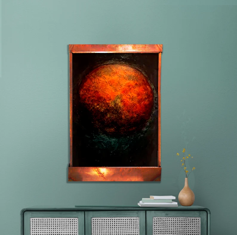 Ex Nihilo, from nothingness comes… well that is up to you with the sculpture. From the Bible, to alchemy, to love or the Big Bang some of the biggest creations came… from nothingness. This wall fountain is an interpretation of that moment. When you look up close at this, you can see forms emerging from the darkness, layers of color and wash revealing form and color depending on the light. No matter how many times you look at this one, you’ll always see something new here. An LED light hood can be added to this piece. |
